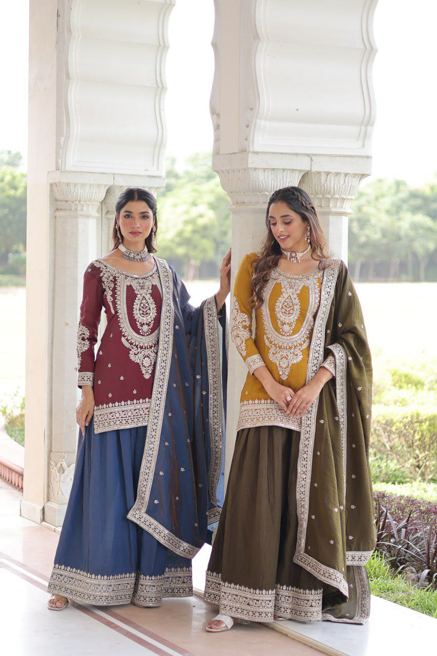 The beautifully designed kurta is paired with a flowy sharara that adds grace to every step. A matching embroidered dupatta completes the ensemble, making it a perfect choice for festive events, parties, and special occasions.