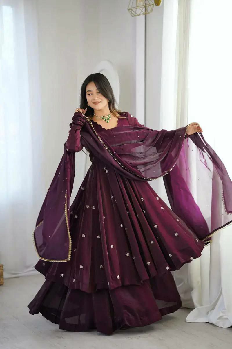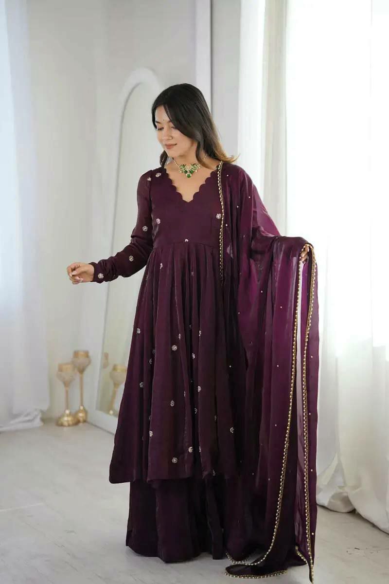 Make a grand statement with this stunning wine Anarkali gown set, designed for a graceful and royal look. Crafted in flowy fabric, this outfit features delicate all-over embellishments that add a subtle sparkle. The beautifully flared silhouette creates a dramatic and elegant movement, perfect for festive twirls and wedding celebrations.