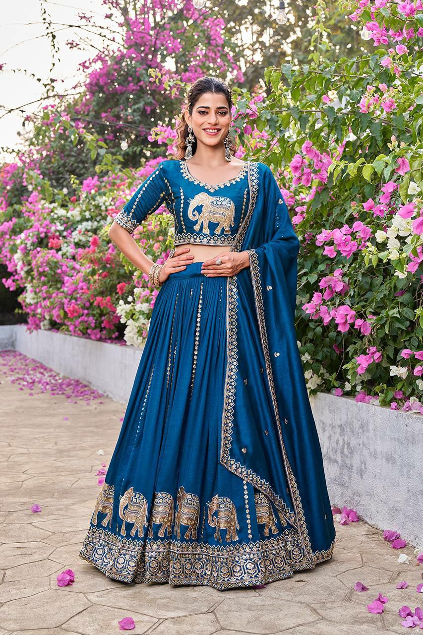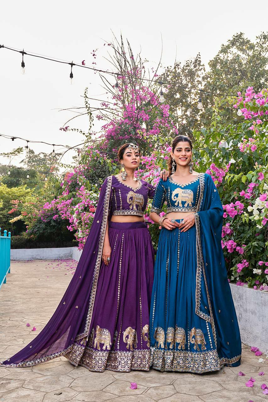Make a bold royal statement with this stunning designer lehenga choli set featuring majestic elephant embroidery. Available in two rich shades – deep purple and royal teal – this outfit blends traditional artistry with modern elegance, perfect for weddings and festive occasions.