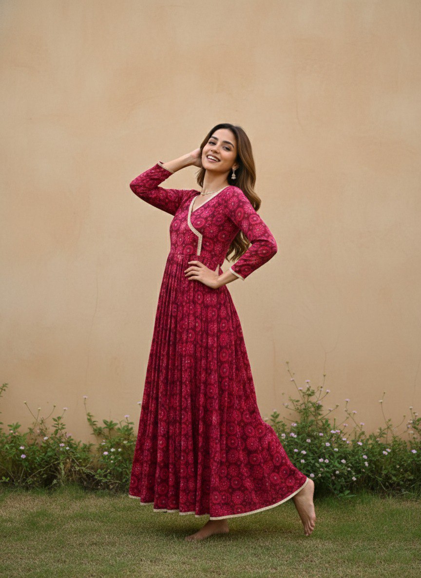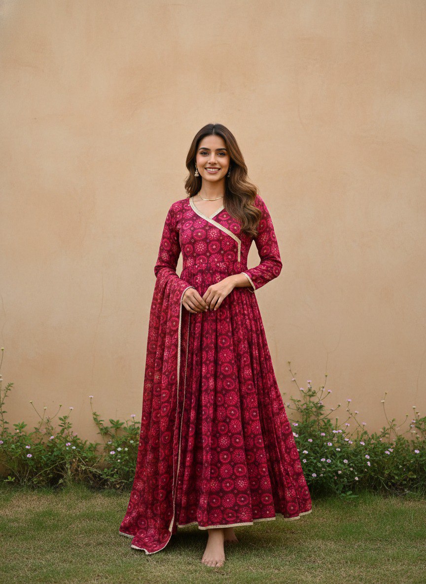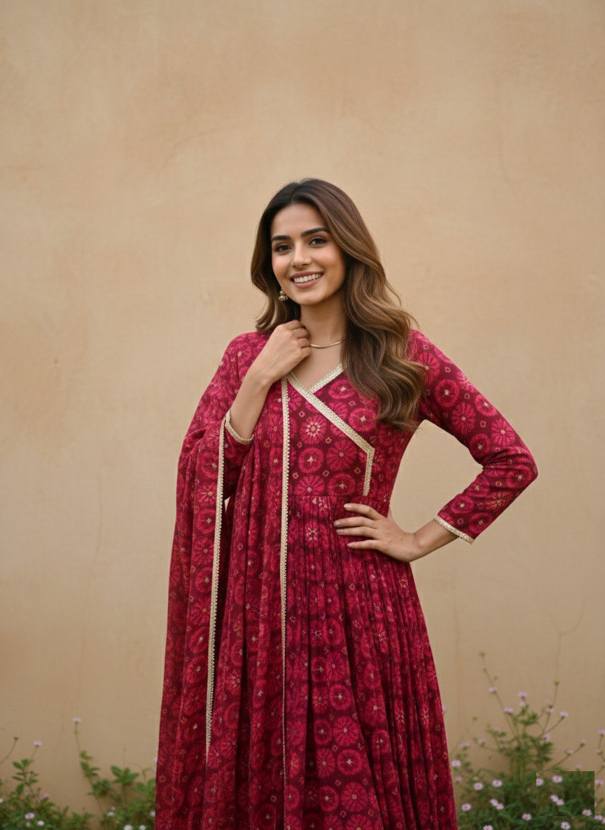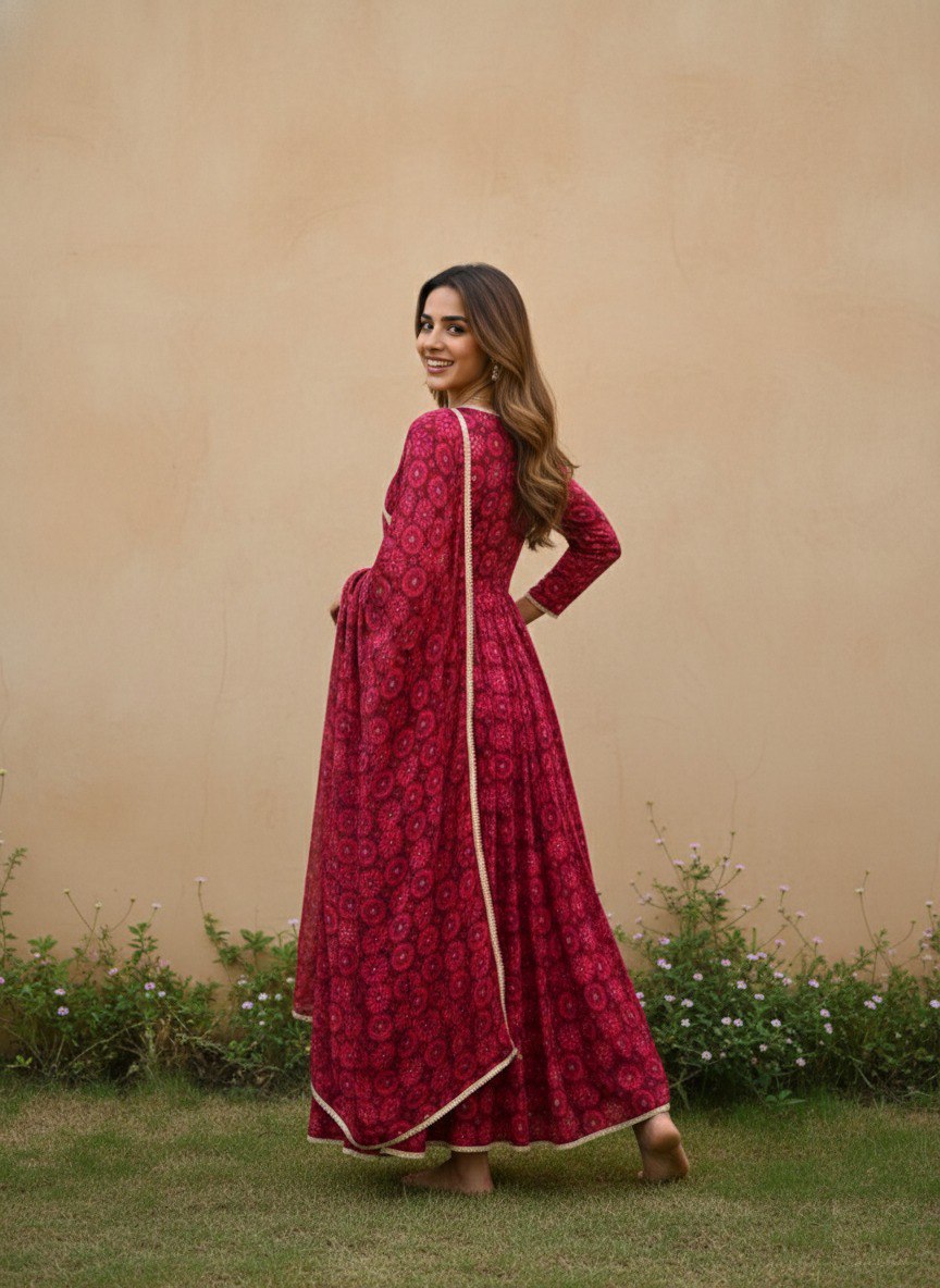 Designed with a rich traditional print, this outfit offers a perfect blend of grace and comfort. The Anarkali-style gown features a flattering V-neckline with delicate border detailing and full sleeves, giving it a sophisticated ethnic look. The flowy flare enhances the overall beauty of the dress, while the matching dupatta completes the ensemble. Ideal for festive occasions, family functions, and celebrations.