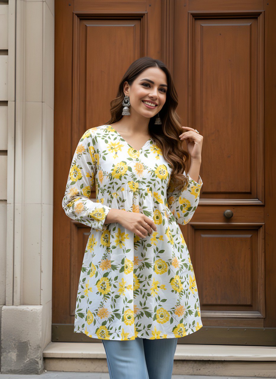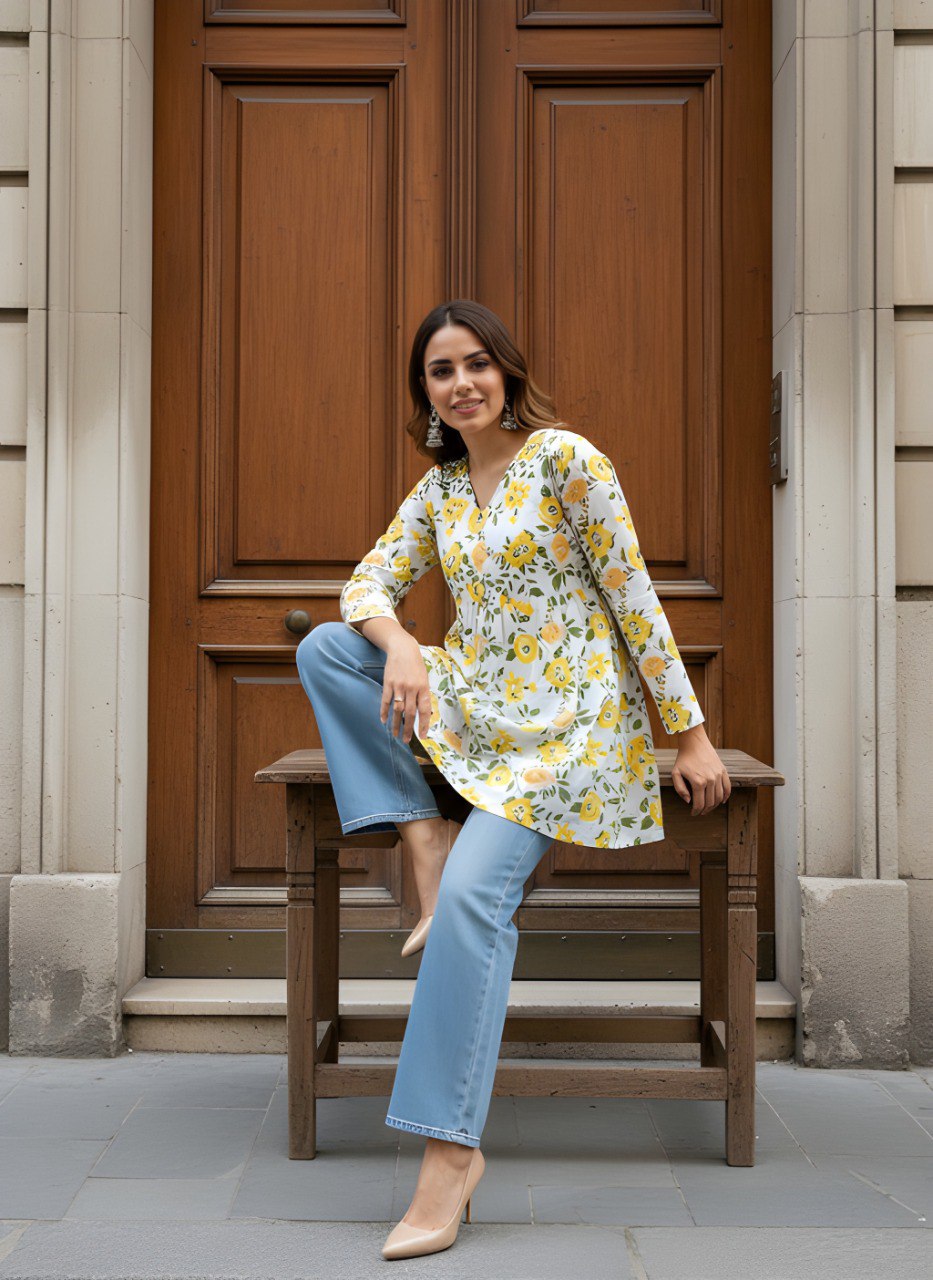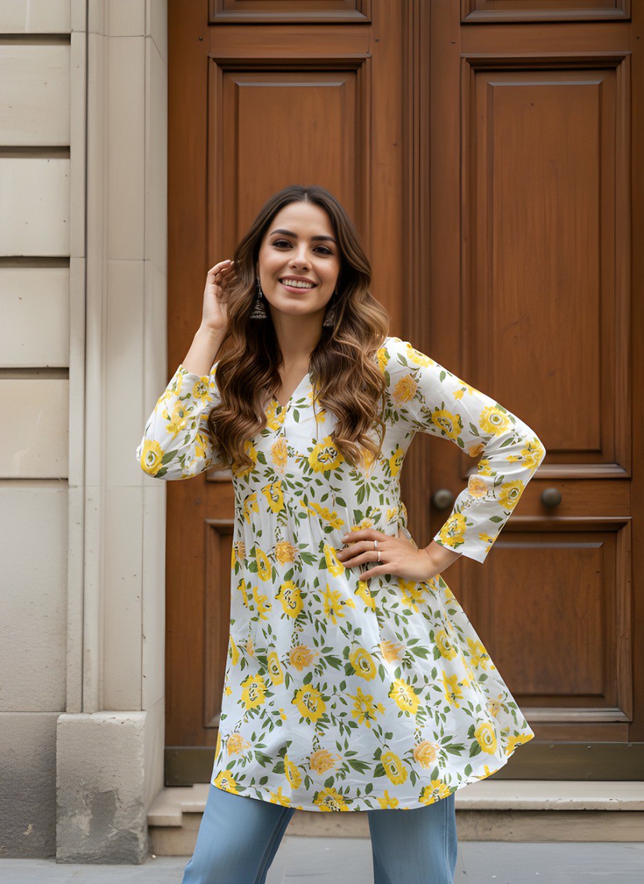 Refresh your wardrobe with this charming White & Yellow Floral Printed Kurti Top. Designed with a graceful V-neckline and full sleeves, this kurti features a beautiful yellow floral pattern with green leaves that gives it a fresh and vibrant look. The lightweight and comfortable fabric makes it perfect for daily wear, casual outings, or office styling. Pair it with jeans, leggings, or straight pants for a stylish and effortless ethnic look.