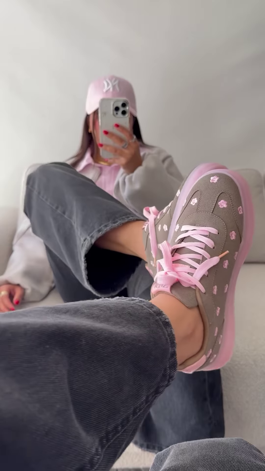 Step into style with these trendy grey and pink floral sneakers. These shoes offer a blend of comfort and fashion-forward design, perfect for adding a touch of charm to your everyday look. The soft grey base is beautifully accented with delicate pink floral patterns, creating a visually appealing and feminine aesthetic.