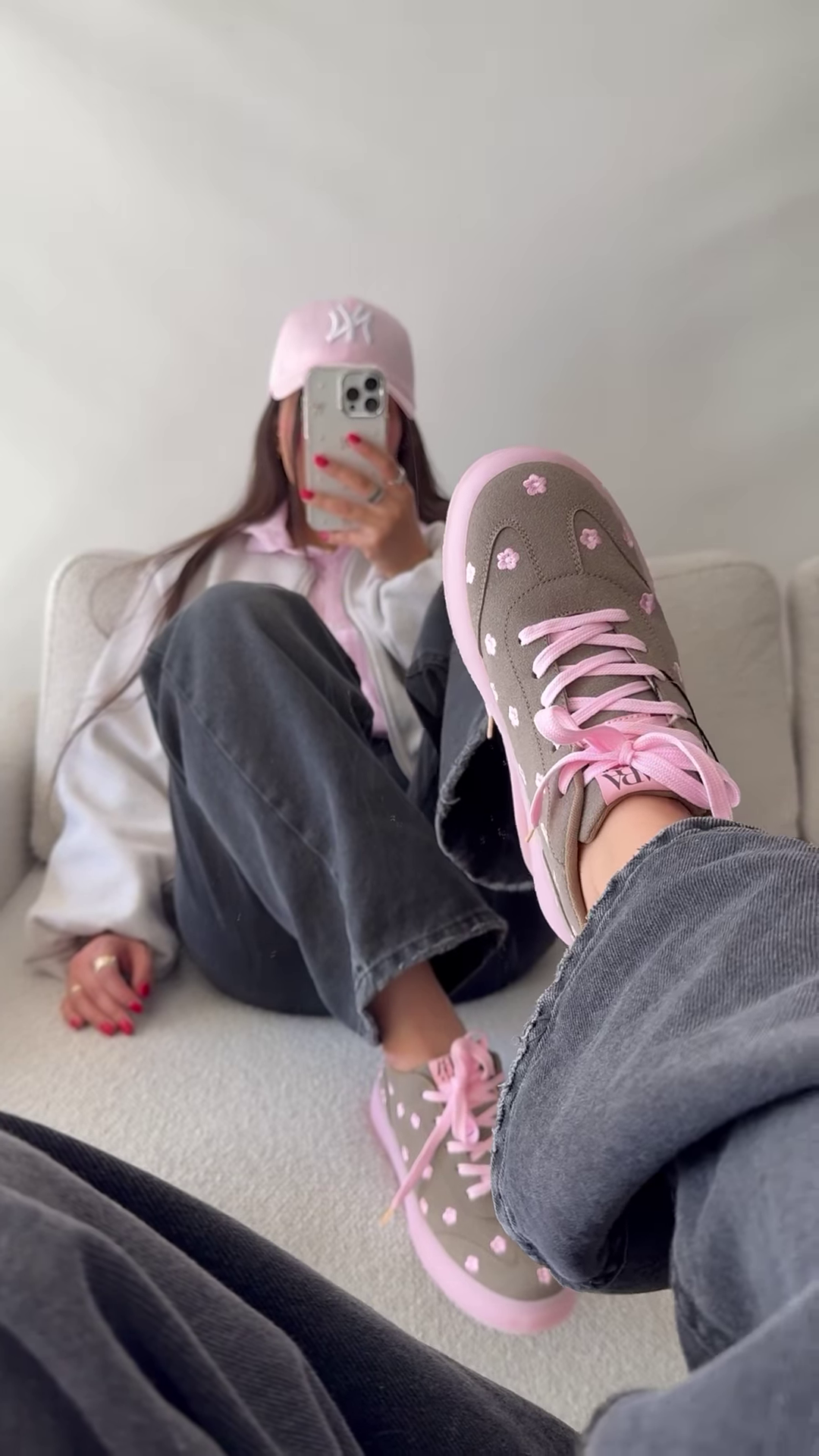 Embrace a blend of style and practicality with these grey and pink floral sneakers, a must-have addition to your footwear collection